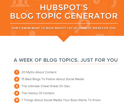 When I am truly stumped on new topic ideas, I refer to resources like HubSpot’s Blog Topic Generator. This free tool generates a week’s worth of custom topics to kickstart the creative process. All you have to do is type in three terms you’d like to blog about and the tool will auto-generate topics for you. Here is an example: