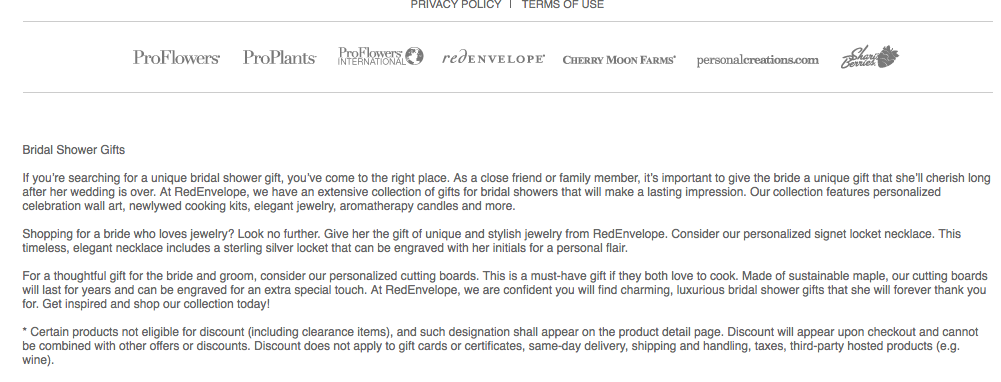 FTD Companies (formerly known as Provide Commerce) is the leading online retailer for gifting brands, such as ProFlowers, Shari’s Berries, Personal Creations, Gifts.com, and ProPlants. During my tenure at FTD, I served on the Acquisition Marketing team, where I worked on a number of projects ranging from weekly data reporting to SEO website content. Below are some examples of footer page content I produced for Shari’s Berries, Personal Creations, and RedEnvelope which contributed to double-digit organic search revenue.
