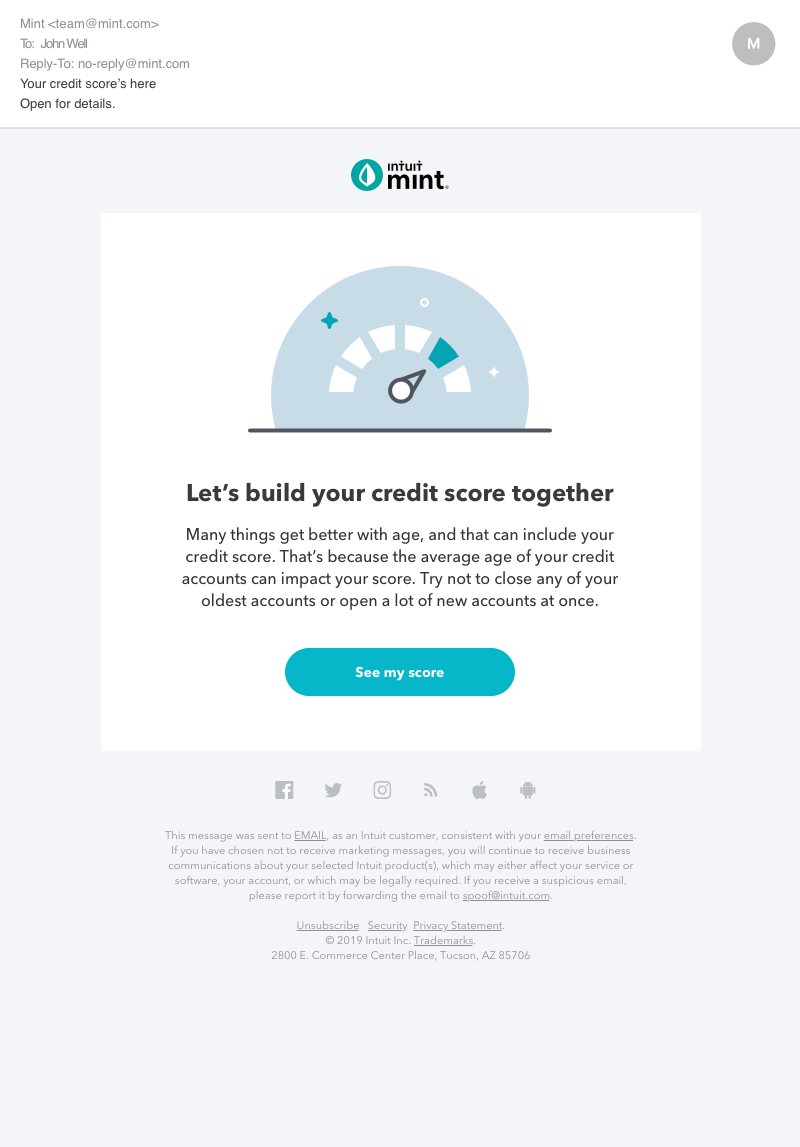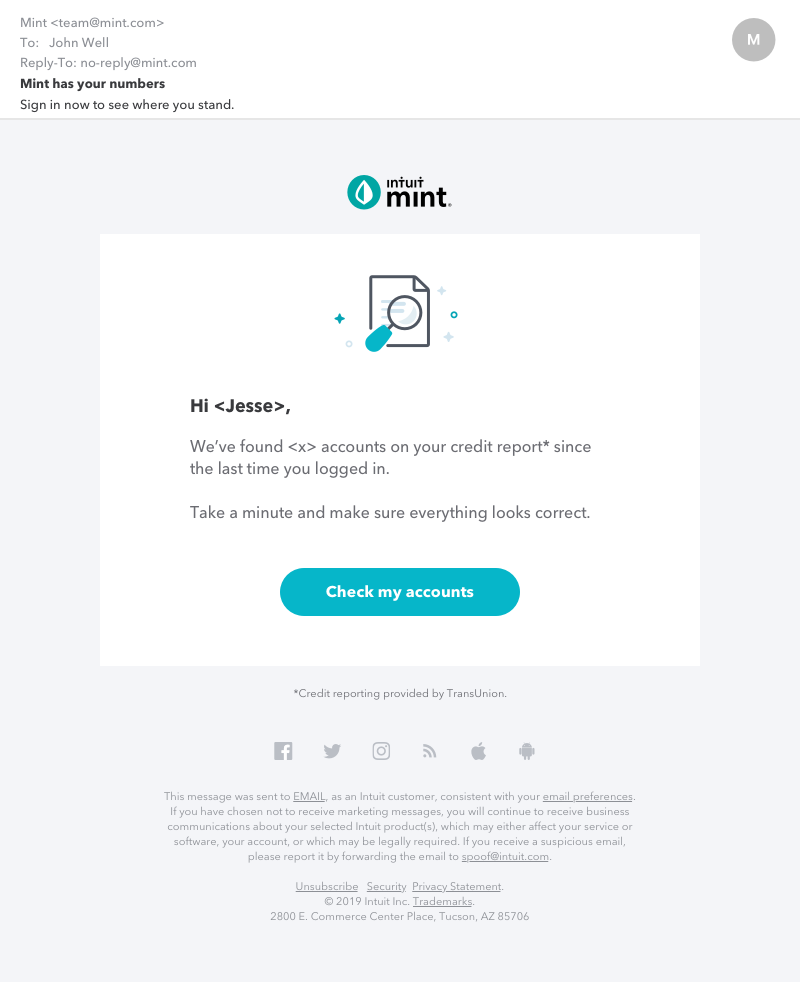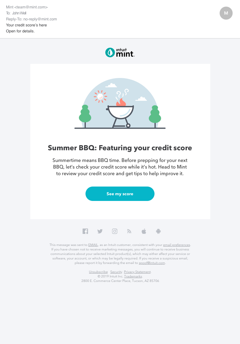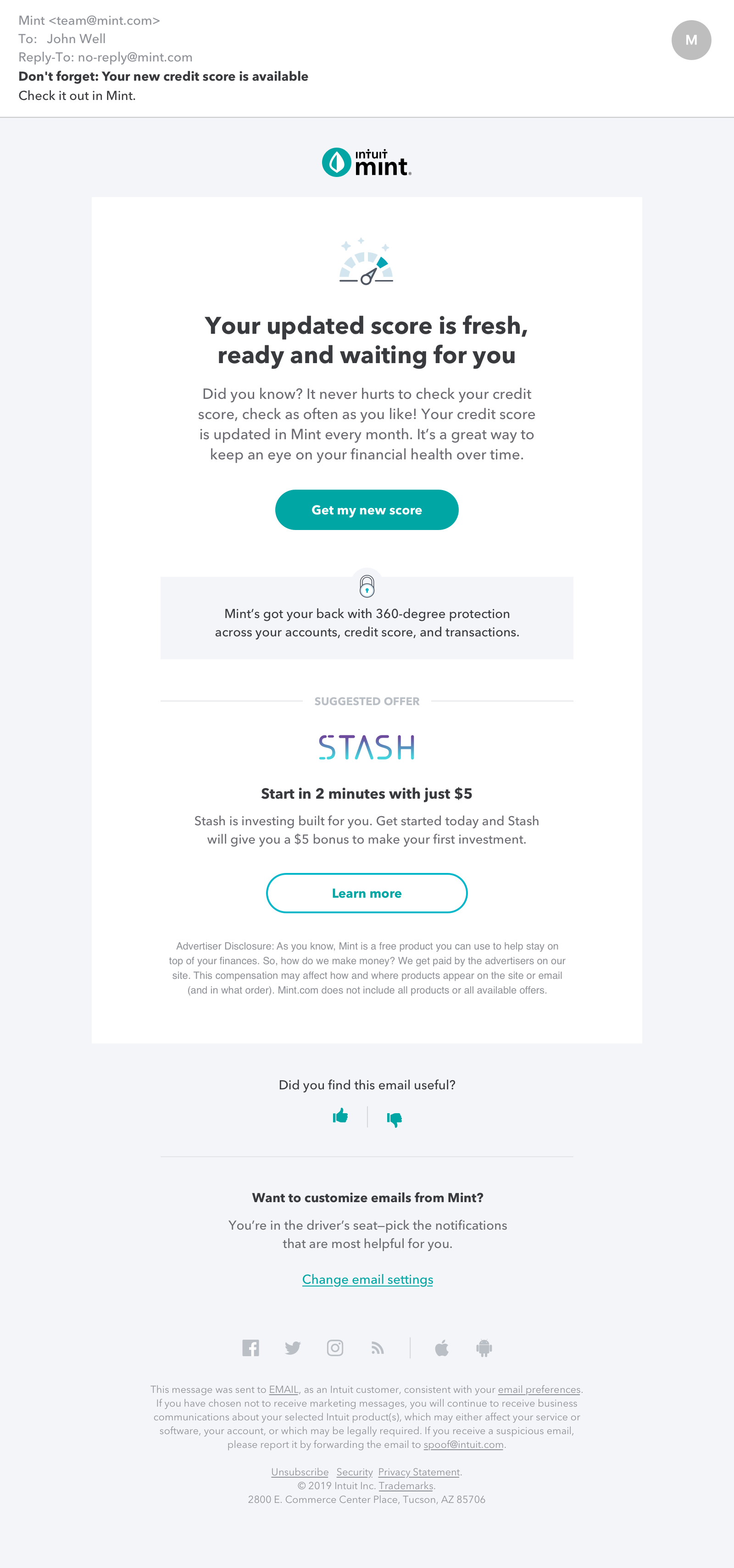 I was the primary copywriter for Mint credit score emails and developed an annual strategy for the email campaigns corresponding to different themes such as annual events, credit score factors, partner promotions, and more.
